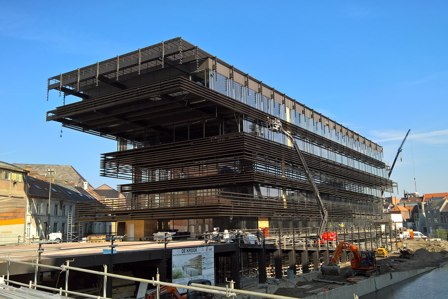 Le bâtiment de 14 000 m2 – répartis sur six étages – s’étend sur une surface de la taille d’un terrain de football et arbore la forme une péniche en métal accostée au centre-ville. Cette construction a nécessité quelque 3 000 tonnes de métal, une composante que l’on retrouve aussi à l’intérieur du bâtiment puisqu’il a notamment été aménagé avec des systèmes de rayonnages en acier réalisés sur mesure.