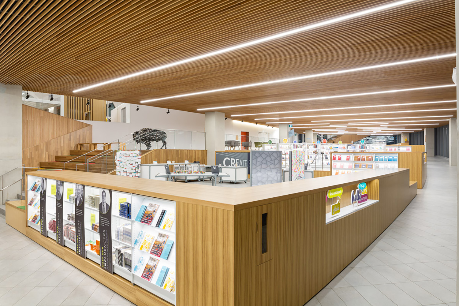 Nous sommes fiers d’avoir fourni notre système de rayonnages Slimline, adapté spécialement pour répondre aux exigences des architectes et de la bibliothèque. Chaque rayonnage individuel possède en outre un éclairage LED particulièrement discret.