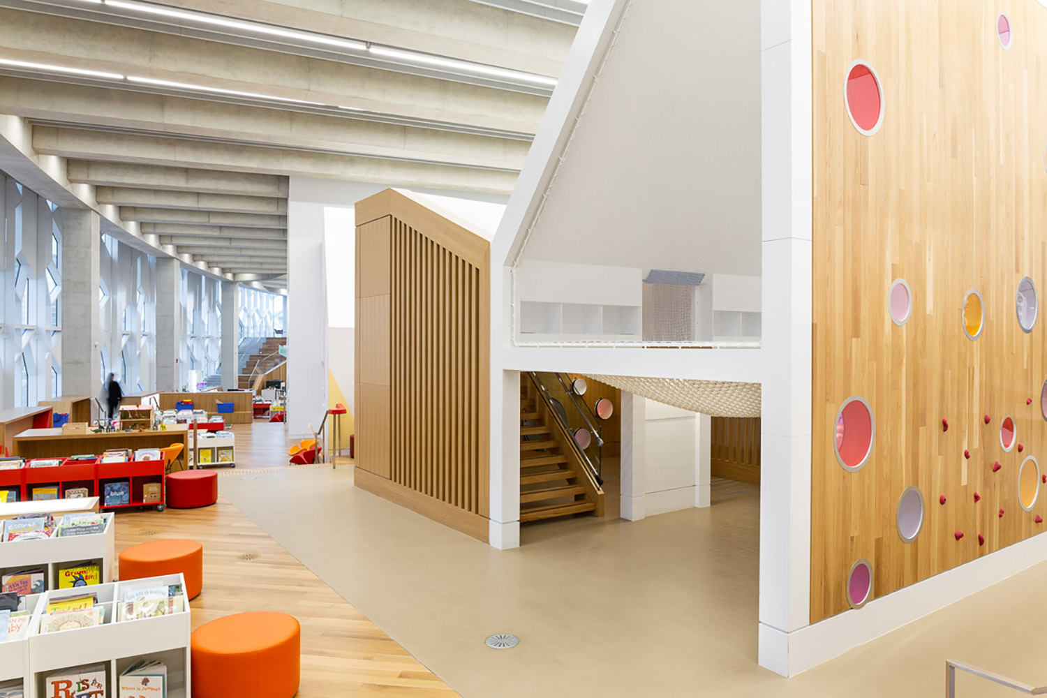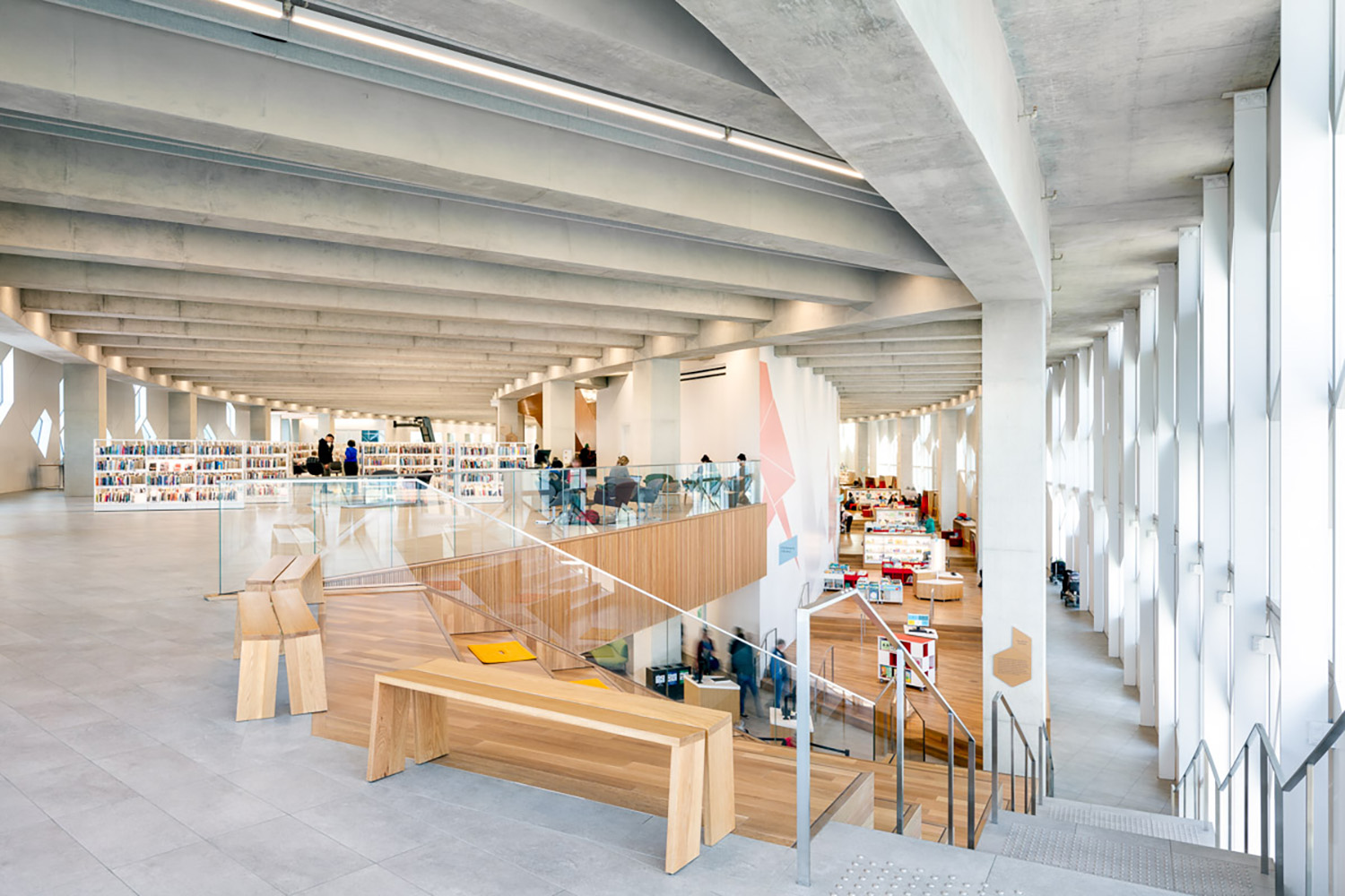 Le bâtiment emblématique en forme d’arc, conçu pour répondre aux normes LEED Gold par les architectes de Snøhetta et Dialog, accueille tout d’abord les visiteurs dans un gigantesque et lumineux atrium offrant une vue impressionnante sur l’ensemble de l’édifice. Les matériaux incurvés en bois apportent élégance et chaleur, et améliorent l’acoustique de l’atrium.