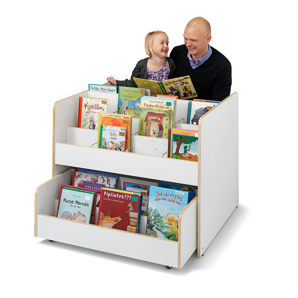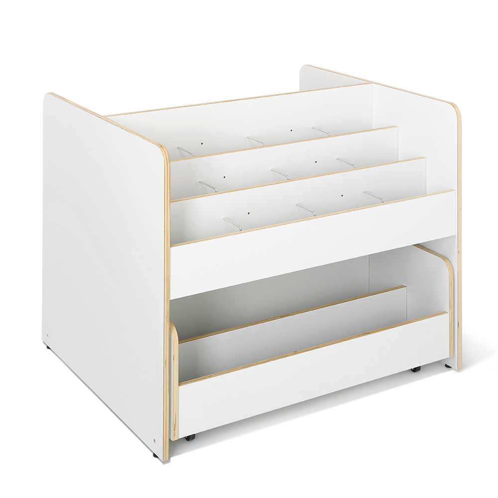 En haut, trois compartiments par section munis de séparations pour exposer les albums de face. En bas, un tiroir pratique par section monté sur roulettes, avec deux compartiments de rangement.