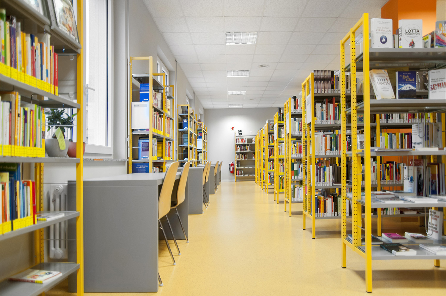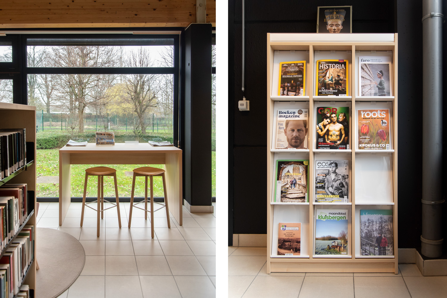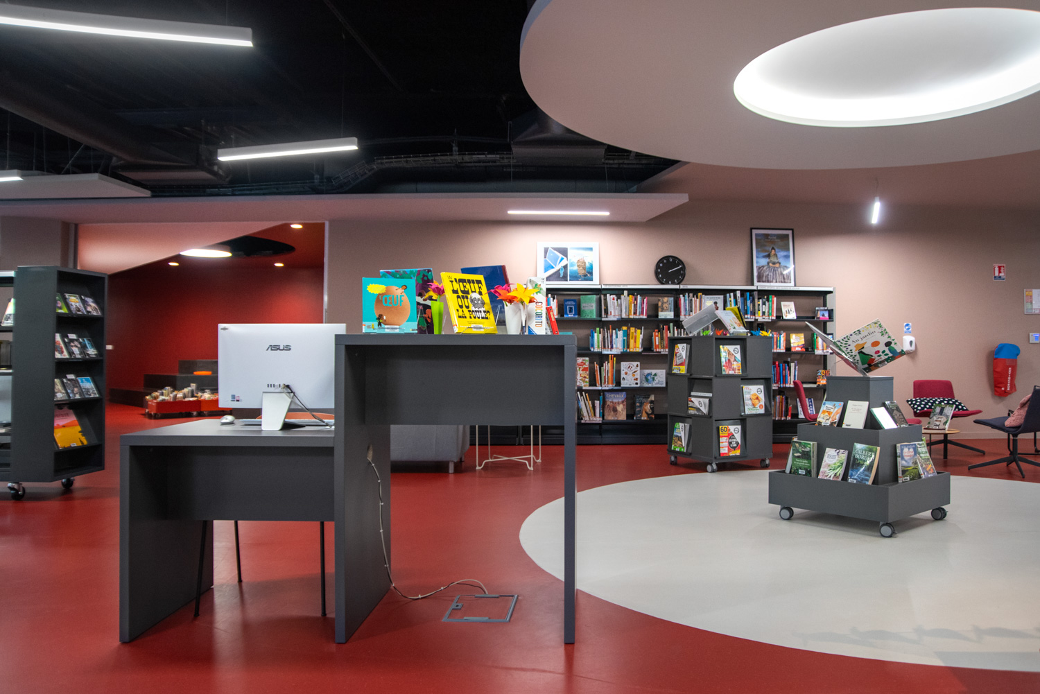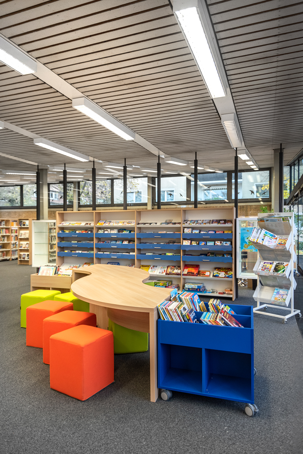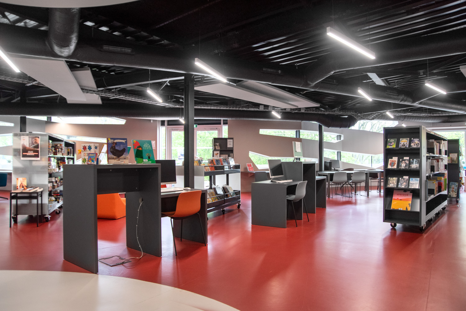 Les tables peuvent être utilisées pour élaborer au sein de la bibliothèque des espaces assis et debout plaisants et intéressants, mais toujours fonctionnels.
