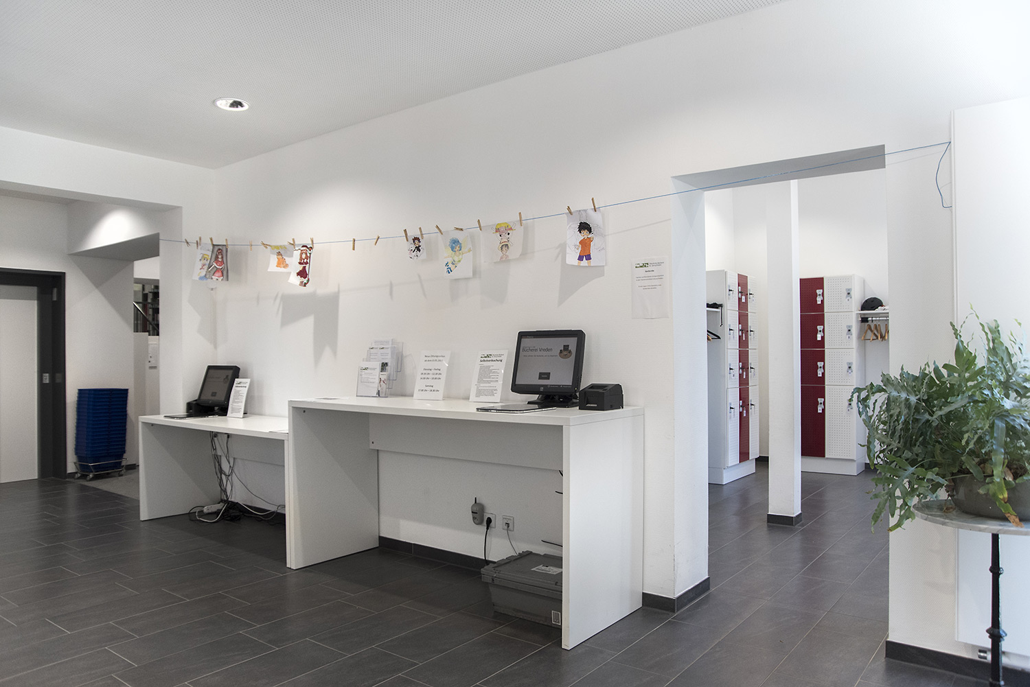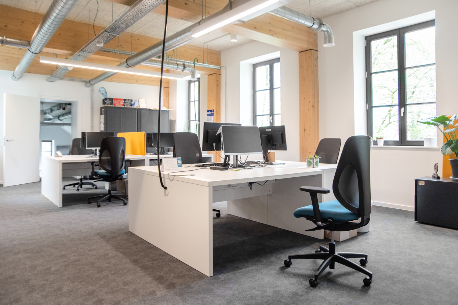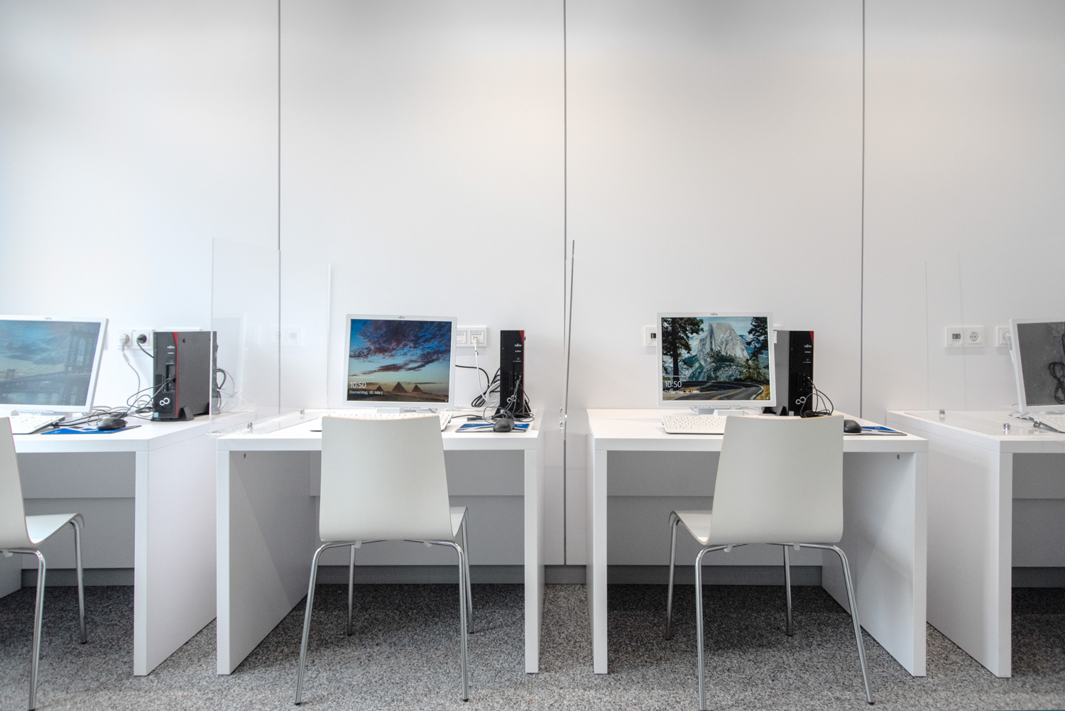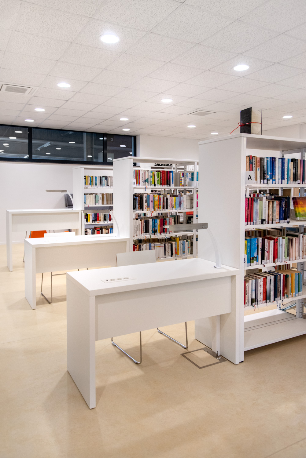 3 bureaux/tables simples et astucieux, assortis au design de la banque d’accueil Inform, du poste de recherche Inform et du rayonnage Inform Courbe.