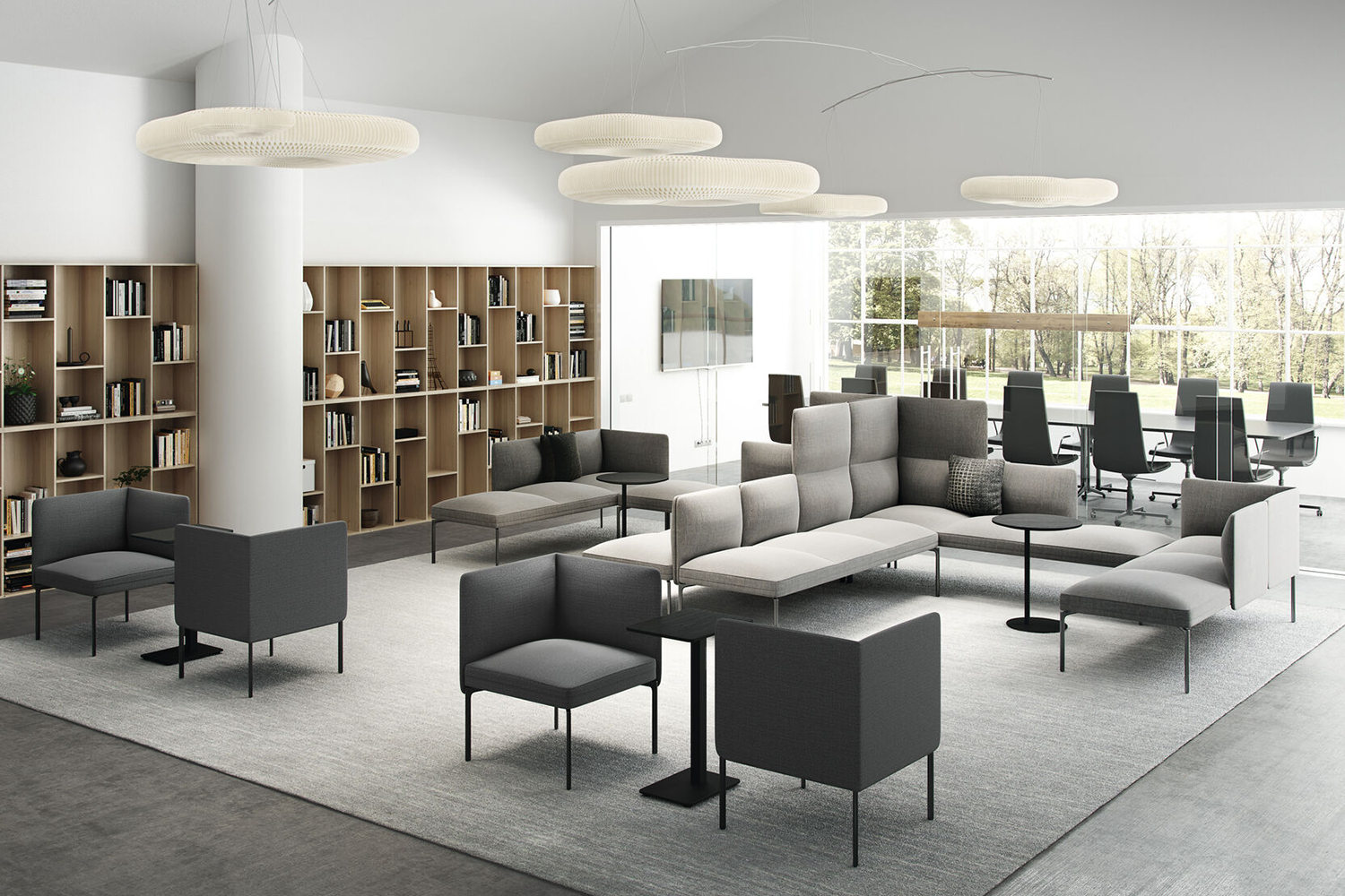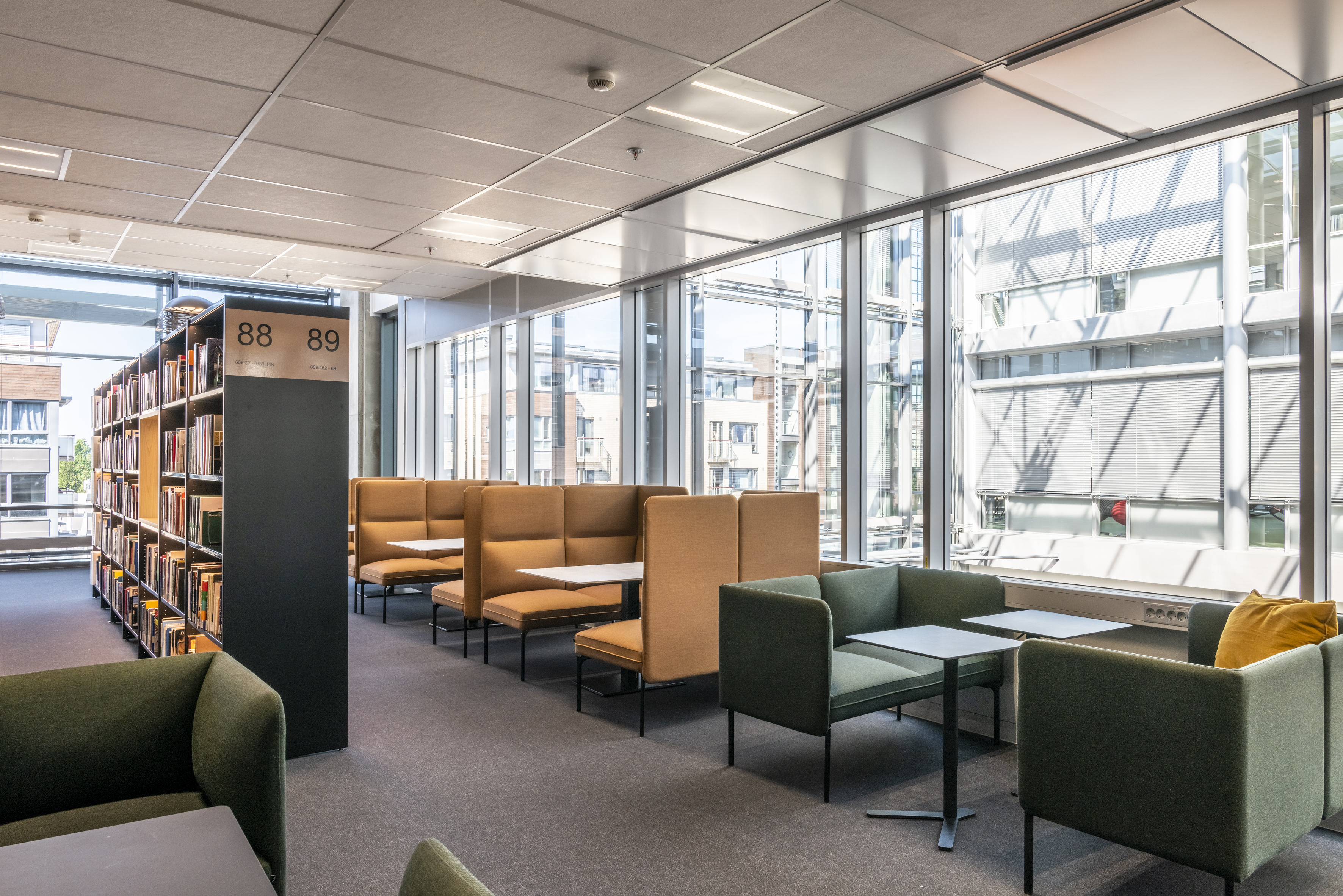 La série Senso tient compte des défis acoustiques que vous pouvez rencontrer dans la bibliothèque. Ses différentes hauteurs de dossier contribuent à atténuer et absorber le bruit ambiant. Il est aussi possible de choisir une structure avec des lattes en chêne qui permettent de cloisonner la pièce en espace de calme, de détente ou de discussion.
