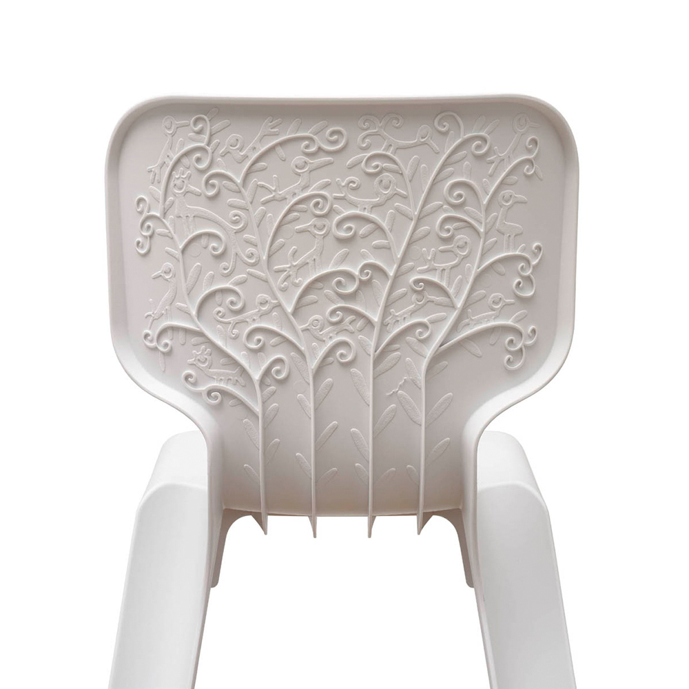 Une chaise légère et empilable avec une assise bien particulière. La face arrière du dossier est décorée d’un feuillage parsemé de petits oiseaux. La chaise est faite de fibre de verre renforcée de plastique aux couleurs représentant les quatre saisons de l’année : vert pour le printemps, orange vif pour l’été, brun pour l’automne et blanc pour l’hiver.
