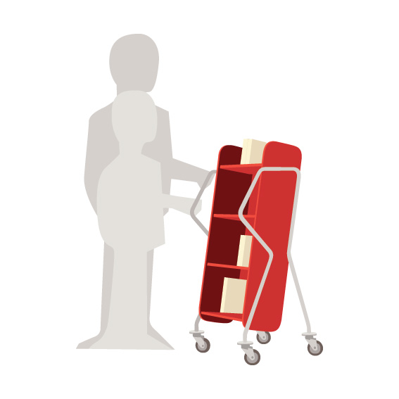 Chariot à 4 étagères fixes généreusement espacées et facilement inclinables. Convient aussi pour les livres de grand format.