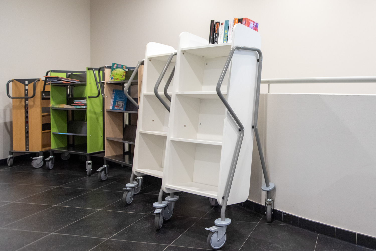 Chariot à 4 étagères fixes généreusement espacées et facilement inclinables. Convient aussi pour les livres de grand format.