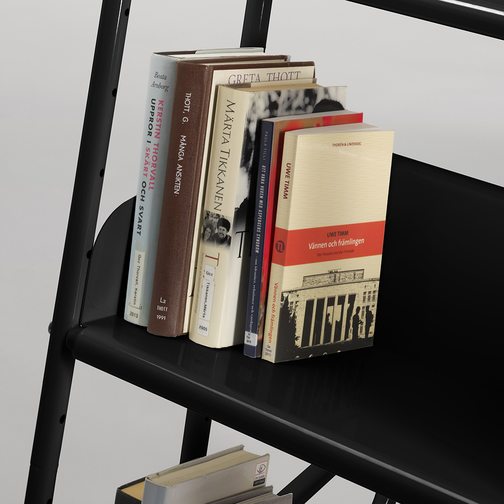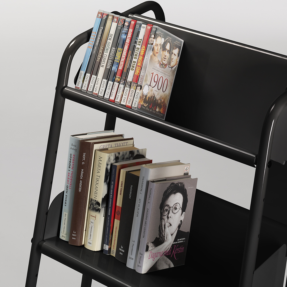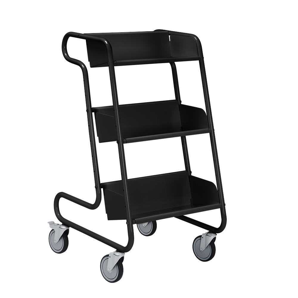 Chariot stable simple face avec trois étagères inclinées, amovibles et réversibles pour différents types de médias et livres. Placez les étagères ou nécessaire en utilisant les trous dans le cadre.