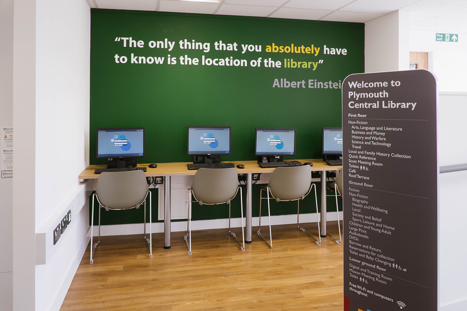 Des meubles Cocoon sont utilisés pour accroître le nombre de places assises et les possibilités de présentation pour la bibliothèque et ses usagers. La présence continue du phare, inspiré de Warhol, sur les panneaux d'extrémité des rayonnages, crée un impact visuel certain. L'utilisation de couleurs vives du rez-de-chaussée renforcent l'ambiance feutrée du premier étage tout en conservant la mise en valeur d'une image emblématique de la ville de Plymouth.