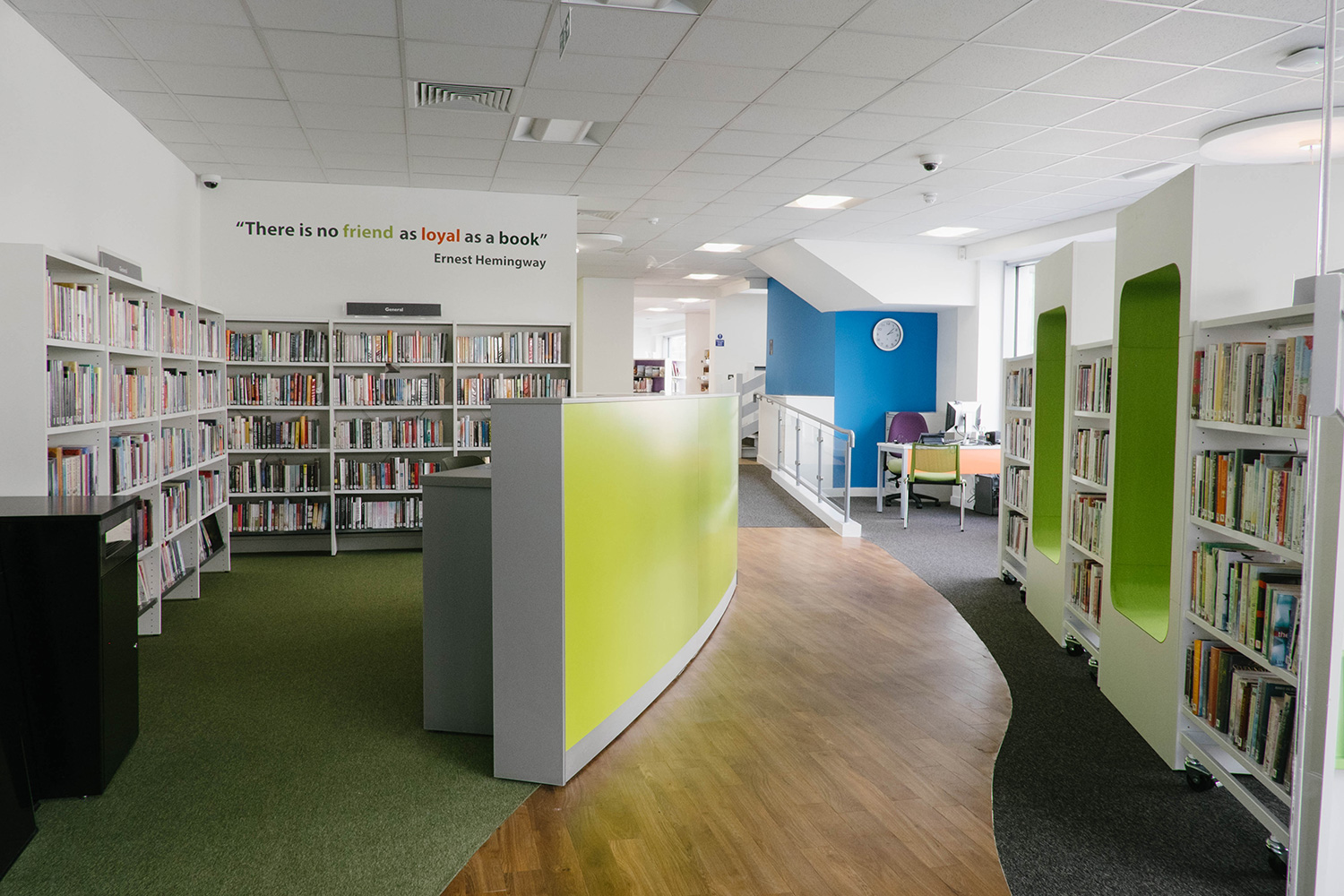 Les visiteurs entrant par l'entrée Armada Way sont encouragés à suivre le cheminement original des meubles Cocoon pour atteindre l'étonnante section jeunesse. Ils sont alors accueillis par un arbre majestueux au centre de l'espace, un élément visuel qui a déterminé l'ensemble de la conception et de la décoration de la bibliothèque. Des meubles aux couleurs vives, des illustrations murales et des panneaux d'extrémité de rayonnages en acrylique inspirés du phare de Warhol animent à merveille la bibliothèque. En total contraste avec le rez-de-chaussée, un changement de style est perceptible au premier étage. Le thème du phare est maintenu pour symboliser la référence à la ville, mais les couleurs changent pour s'adapter à un environnement plus sobre et plus convivial.