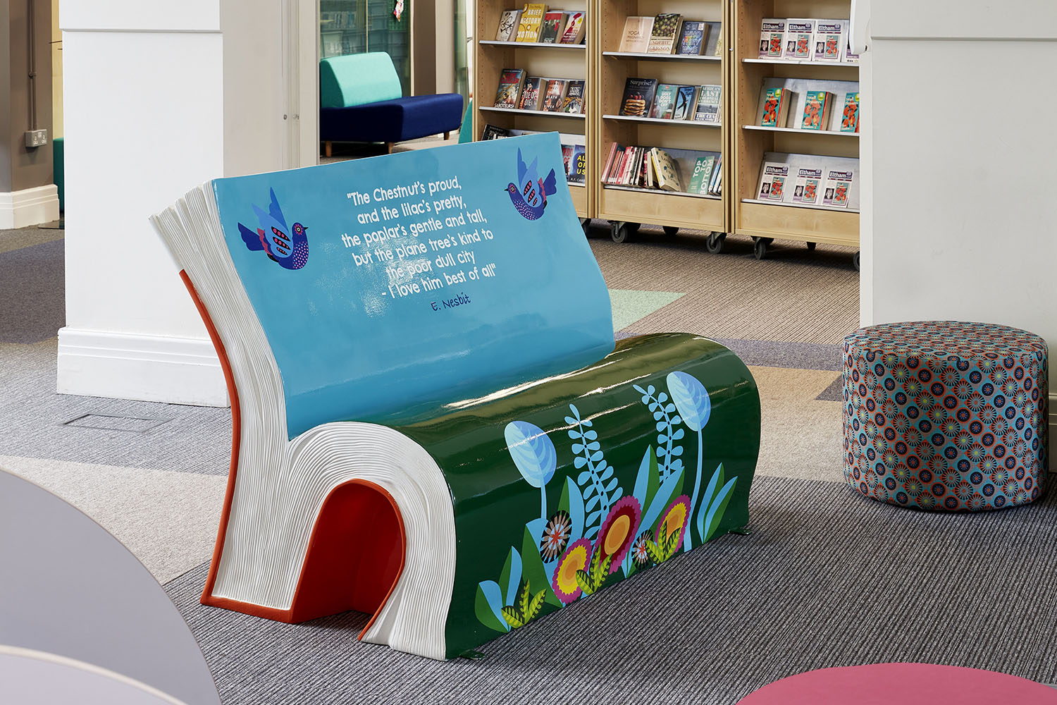 - Une magnifique banquette originale en forme de livre, conçue par un artiste, illustre et reflète également le concept du « jardin enchanté ».