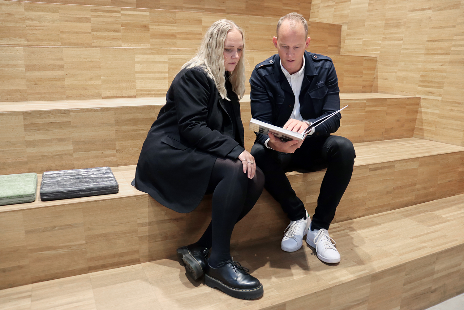 Les coussins sont disponibles dans plusieurs couleurs marbrées, inspirées par la nature. A poser sur le sol mais aussi sur gradins ou banquettes.