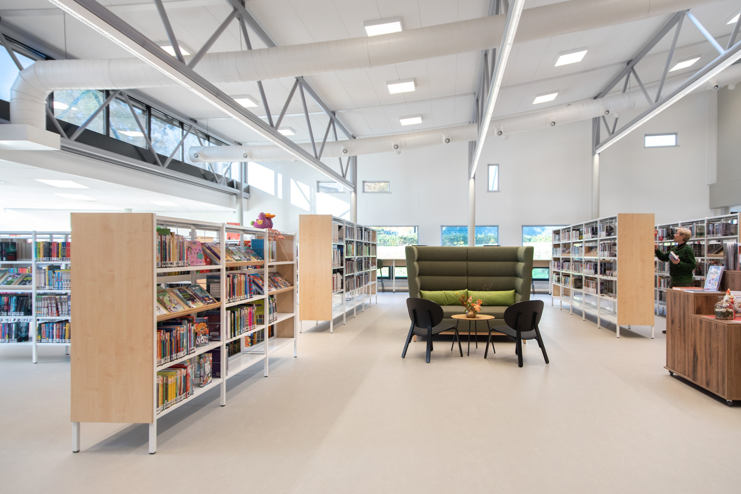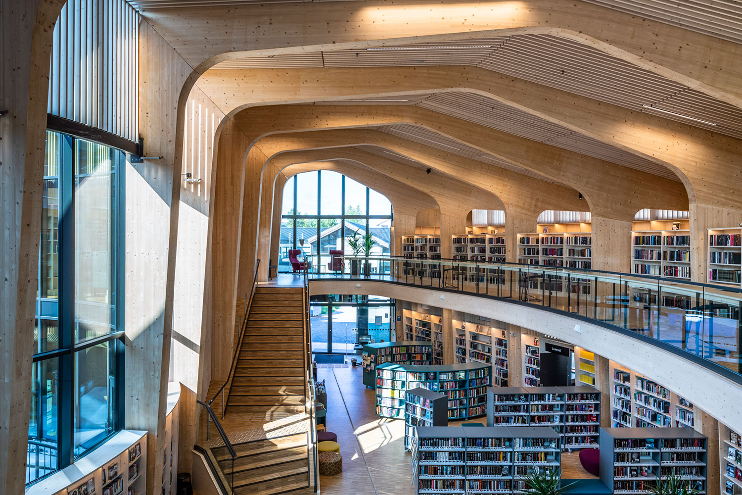 Plusieurs de ces projets de bibliothèques, pour lesquels nous avons réalisé l'ensemble de l'aménagement intérieur, démontrent efficacement ce mélange de paysages biophiliques et d'architecture en bois présents dans l'ensemble des bâtiments.