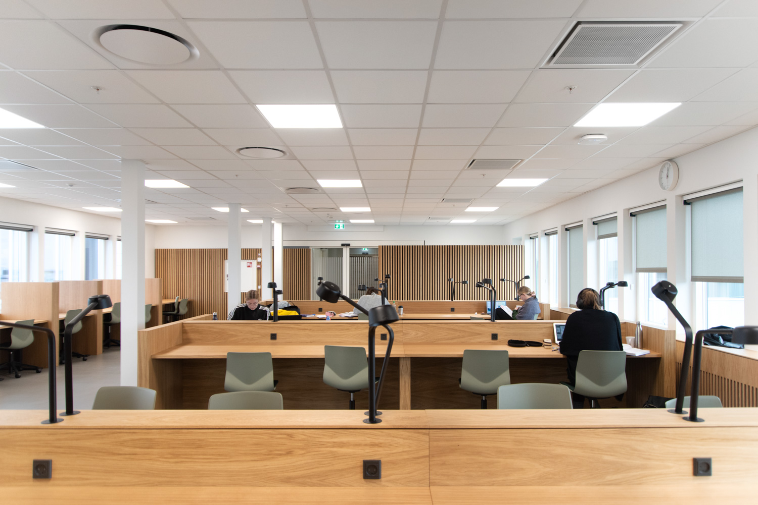 Les systèmes d'étagères et les tables de lecture ou de travail en bois offrent un contraste magnifique et chaleureux avec le reste des bâtiments de la bibliothèque publique de Wateringen, aux Pays-Bas, et de l'hôpital d'Esbjerg, au Danemark, en association à la vie en extérieur.