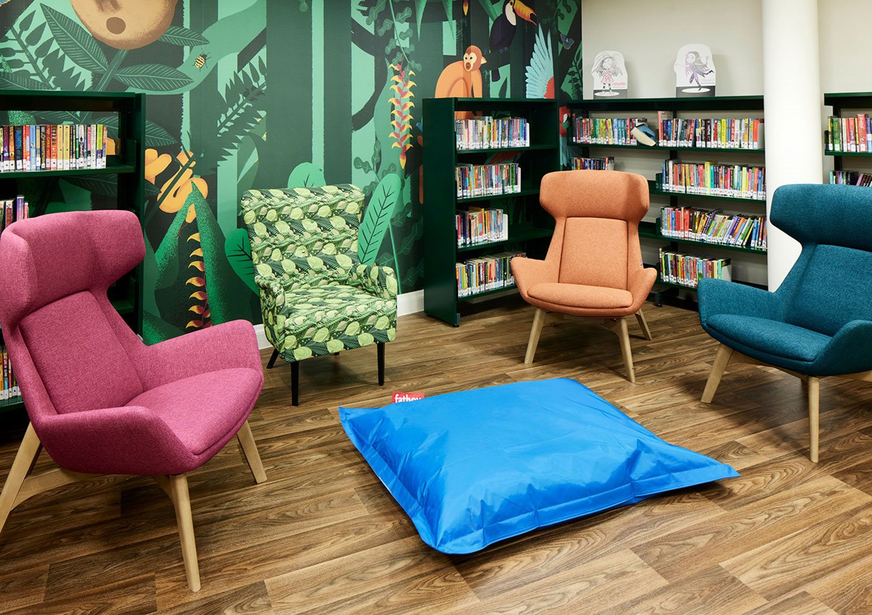 Lors de la création d'environnements biophiliques au sein des bibliothèques, les tissus et les surfaces doivent s'adapter au thème général et au mobilier afin de susciter des émotions positives et le sentiment de ne faire qu'un avec la nature. Nous sélectionnons minutieusement les différents tissus et matières pour chaque projet.