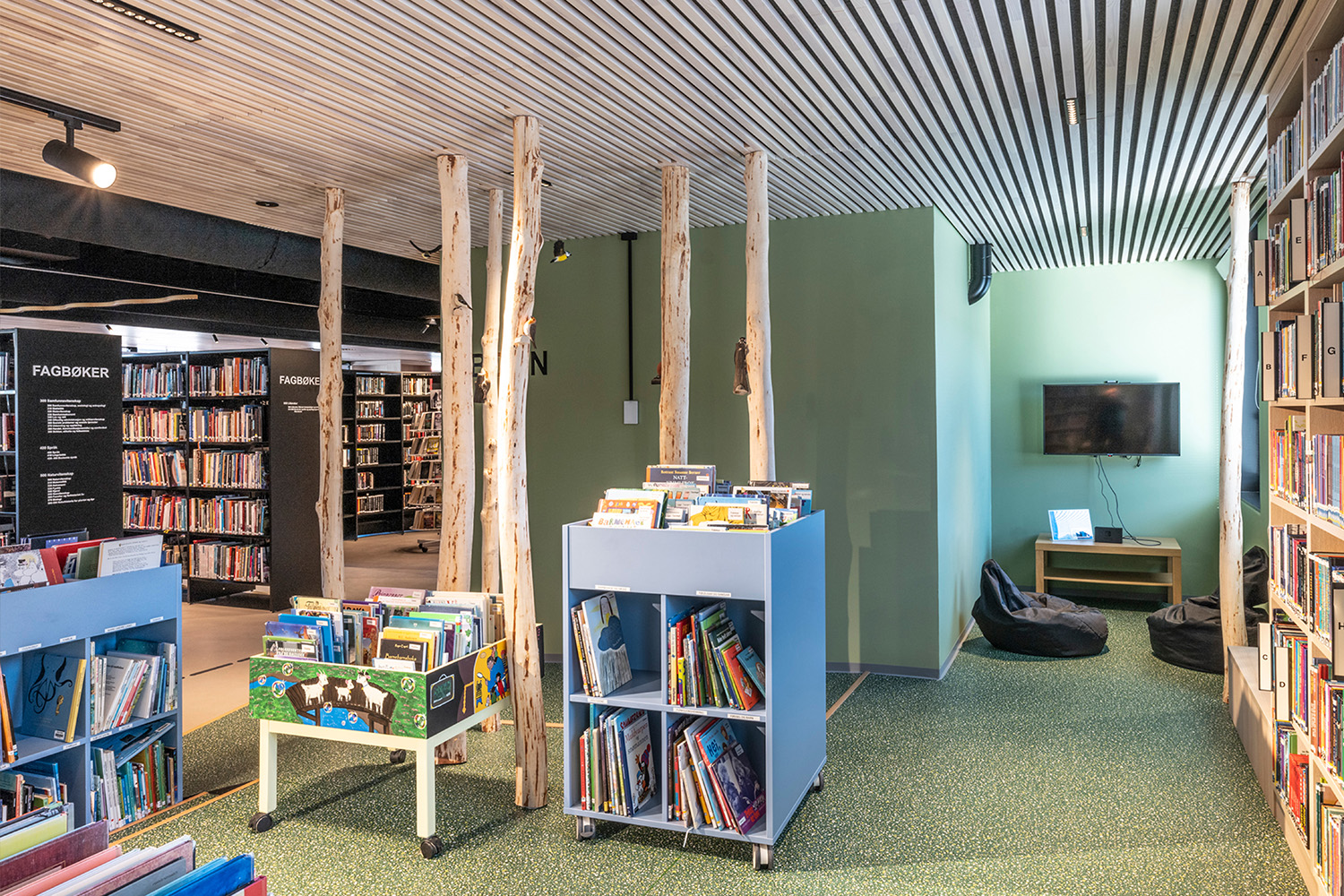 En intégrant des matériaux et des textures imitant les éléments naturels tels que le bois, la pierre et les plantes, les bibliothèques peuvent ainsi créer des espaces qui invitent à l'exploration et à l'interaction. Des sièges inspirés de la nature combinés avec des panneaux muraux texturés ressemblant à de l'herbe ou à de la mousse améliorent l'intérêt visuel mais encouragent également les usagers à interagir avec leur environnement.