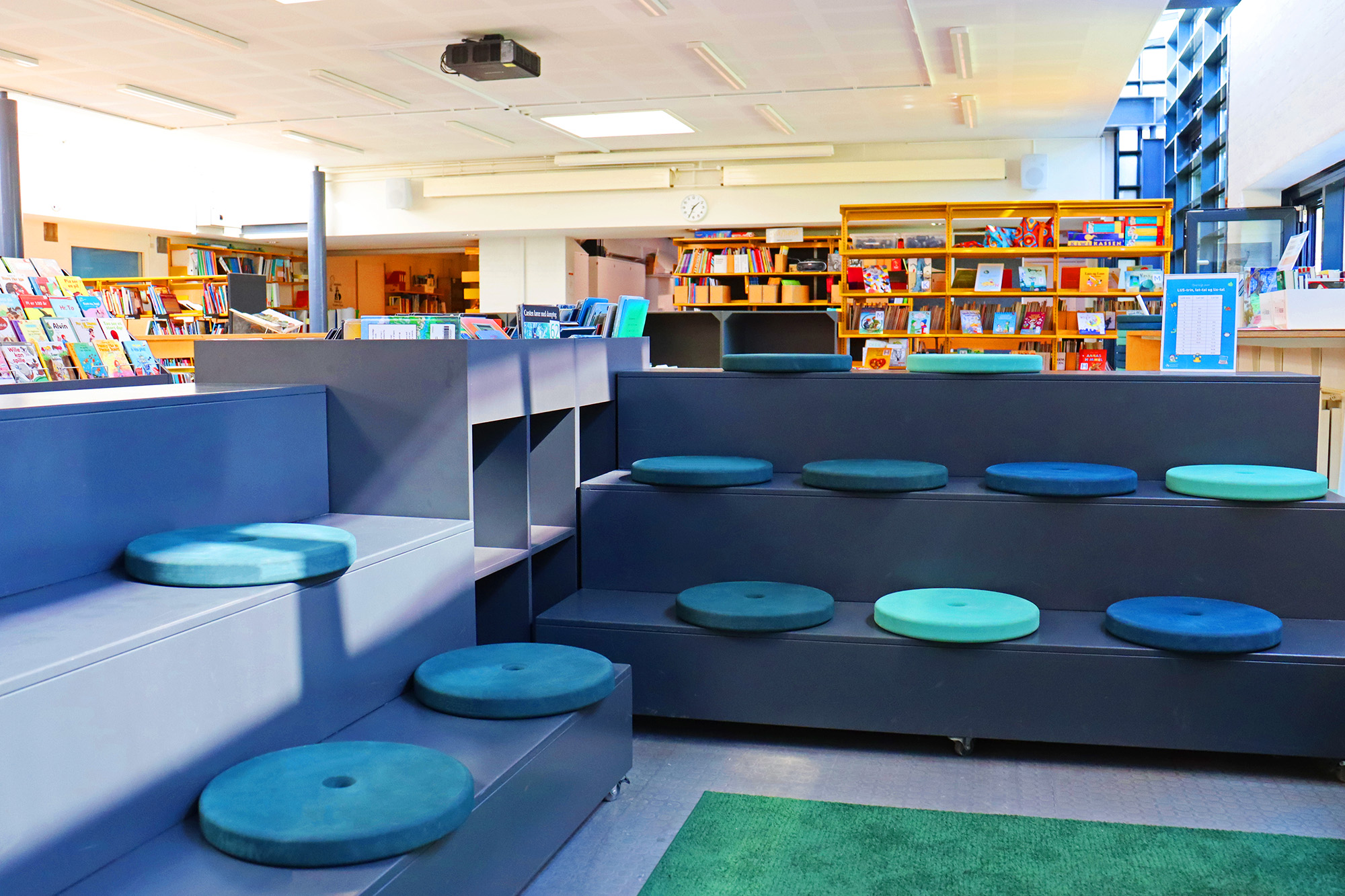Dans l’école Kathrinebjerg d’Aarhus, les coussins Eva ont été choisis dans des couleurs vertes et bleues. Les coussins sont utilisés à différents endroits dans la bibliothèque, par exemple, sur le podium de lecture près de la lumineuse baie vitrée mais également dans les petites niches de lecture où les enfants peuvent confortablement et tranquillement s'asseoir sans être dérangés pour lire un livre.