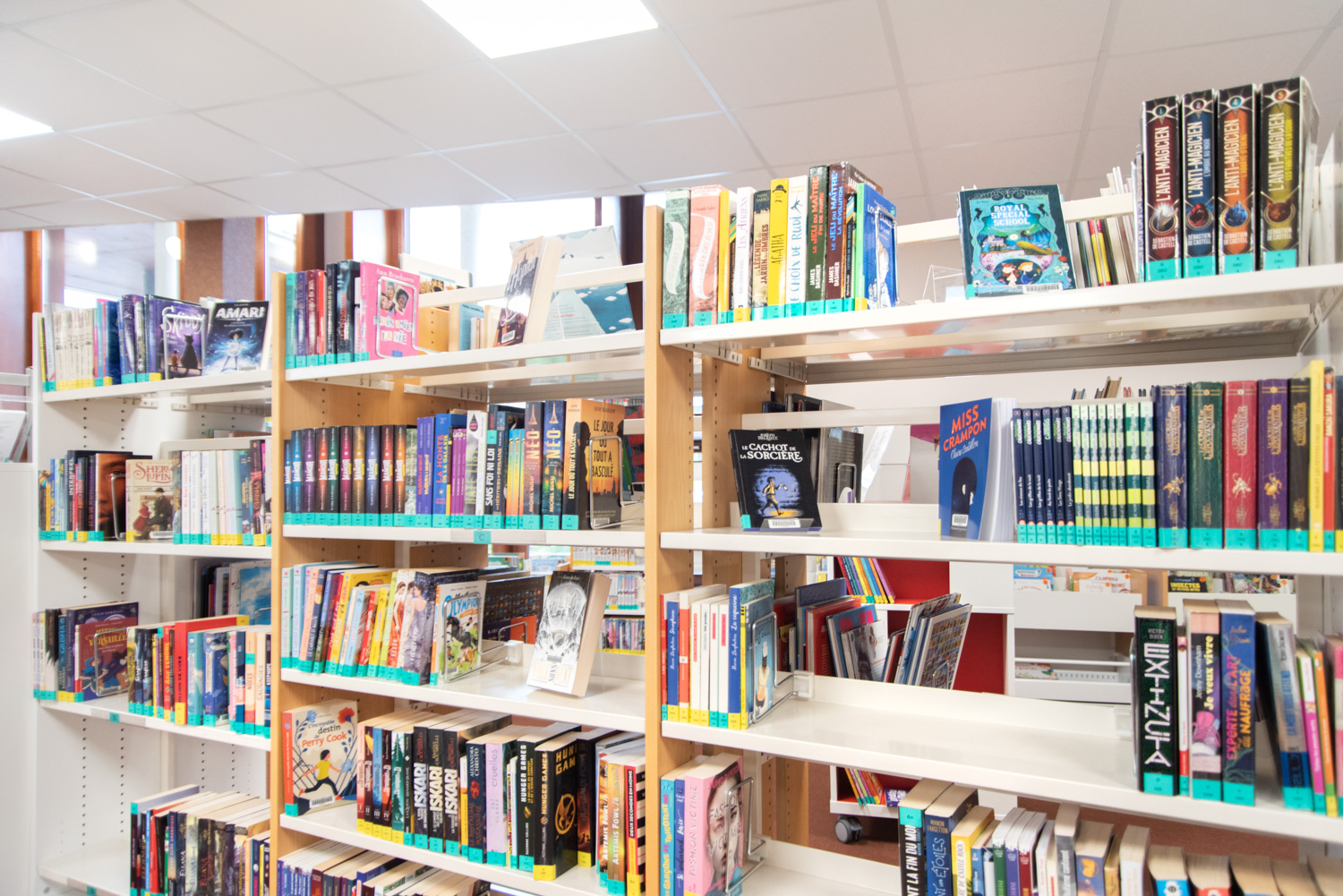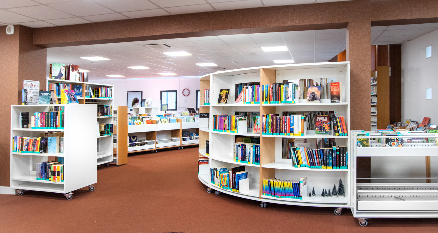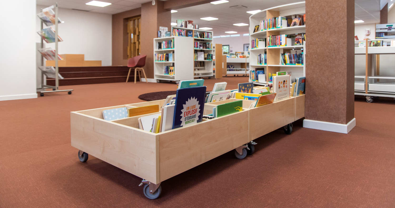 Lors du réaménagement, nous avons ajouté des roulettes verrouillables aux les structures d'étagères. Cela a permis de créer une flexibilité pour tous les rayonnages et ainsi pouvoir reconfigurer les espaces à tout moment. Nous avons également mis en place des tablettes de couverture sur l'ensemble des rayonnages afin de créer une image épurée et élégante et offrant, de plus, un support de signalisation et de présentation supplémentaire, favorisant ainsi la recherche et un design au service du lecteur.
