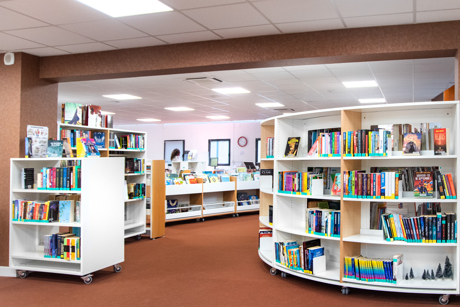 De nouvelles étagères, mobiles et courbes, basées sur la même gamme de rayonnages, complètent l'équipement et s'harmonisent parfaitement avec les étagères d'origine "aujourd'hui relookés" en utilisant des coloris, des matériaux et une esthétique appropriés.