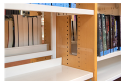 Avant la rénovation de la bibliothèque, les livres et autres documents étaient rangés sur des étagères fixes, rectilignes et ouvertes sur le dessus, ce qui donnait un aspect désordonné à l'espace. Les rayonnages classiques existants, d'une hauteur de 152 et 182 cm, ont pu être reconfigurés (ce qui est difficile à réaliser avec des rayonnages fixes) pour s'adapter aux nouveaux objectifs du projet et au nouveau zonage de l'espace.