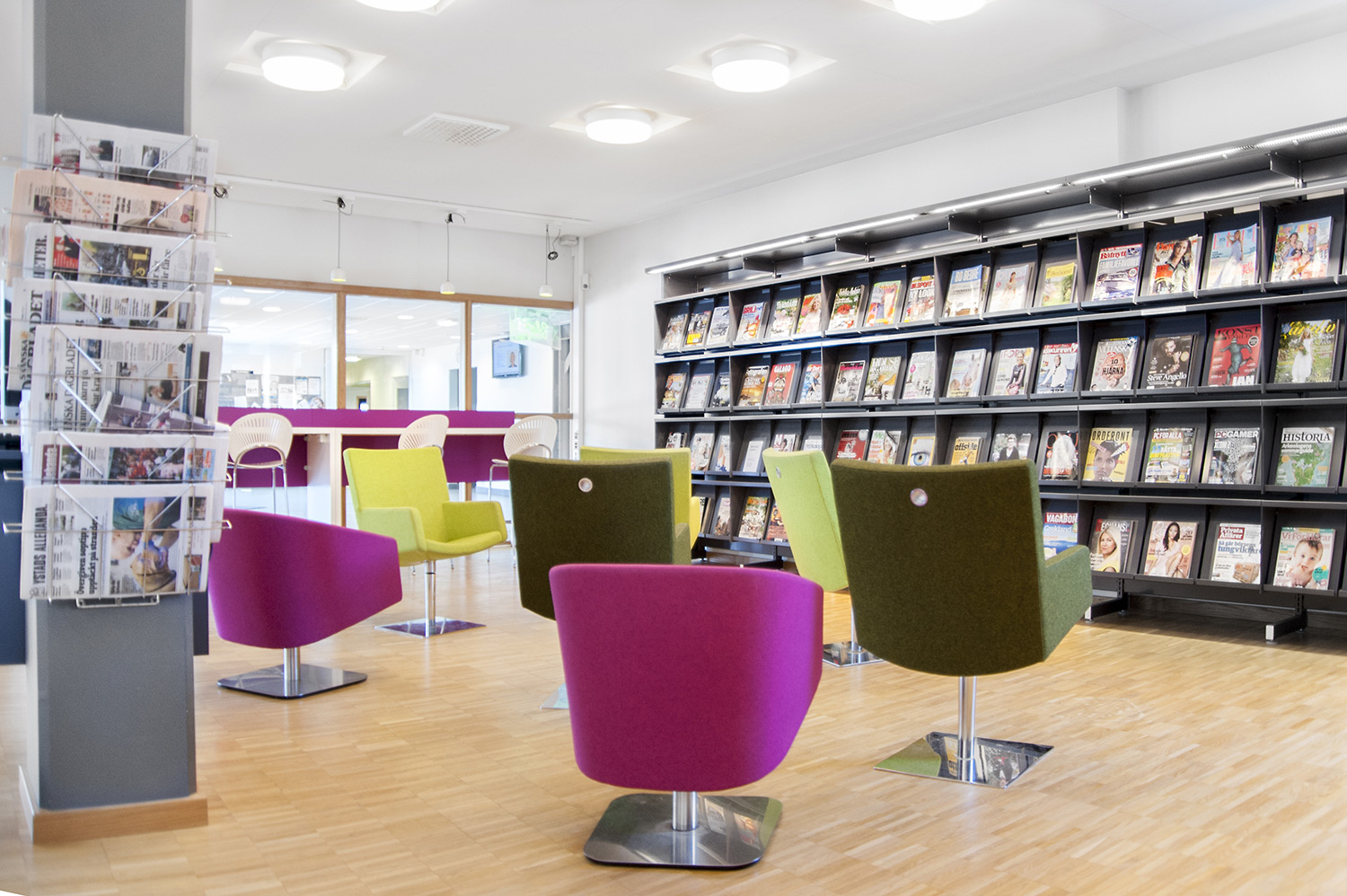 La plupart des utilisateurs considèrent la lecture des journaux et périodiques comme un plaisir personnel et un moment de détente. Cet espace est donc généralement aménagé à proximité de la zone d’accueil et de préférence non loin d’une fenêtre offrant un bon éclairage naturel et si possible, une vue agréable. Si la bibliothèque possède une cafétéria, il peut être judicieux de prévoir cet espace juste à côté afin que le visiteur puisse se consacrer à sa lecture des dernières nouvelles du monde devant une bonne tasse de thé ou de café.
