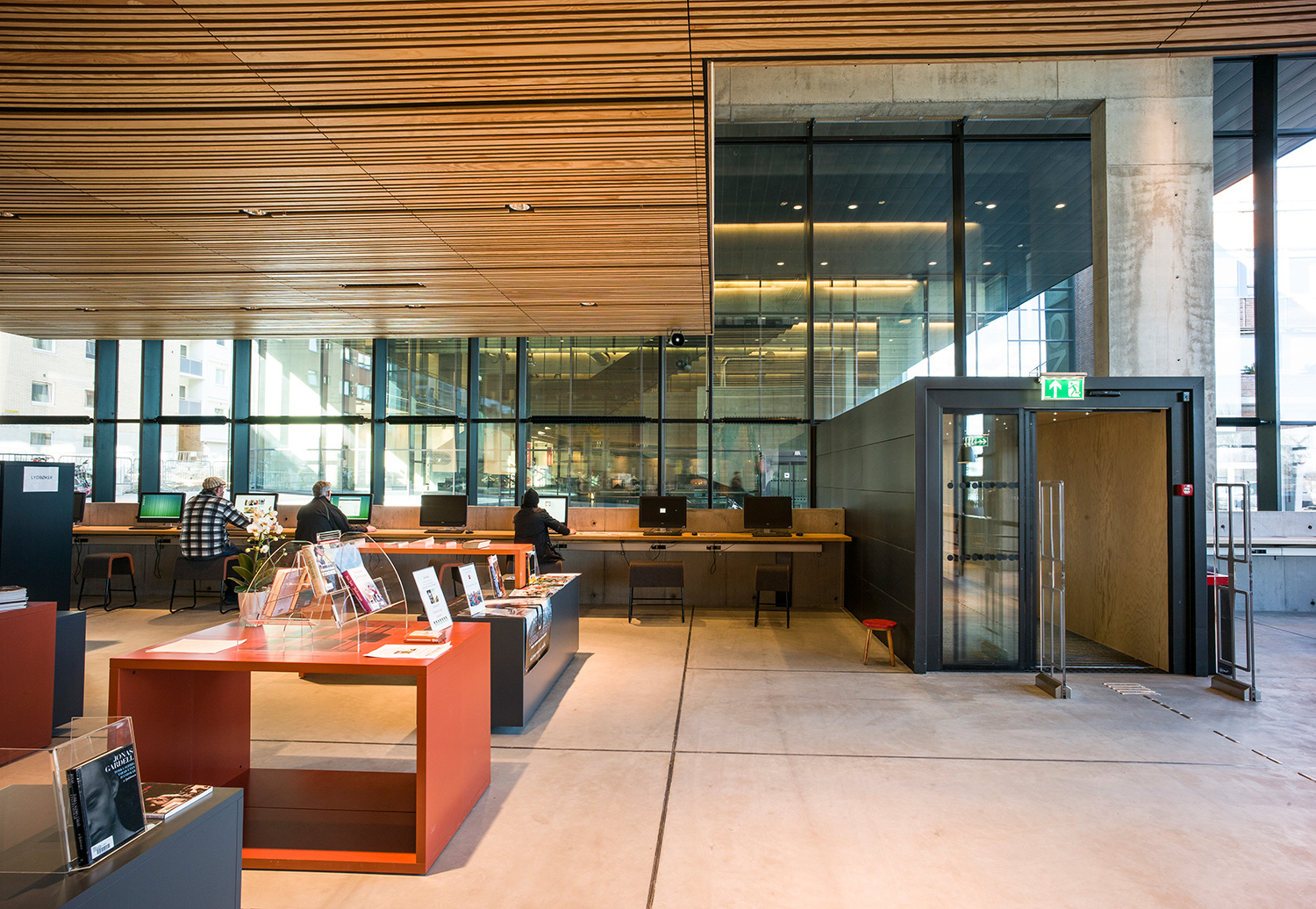 La zone d’accueil est l’endroit idéal pour exposer les dernières nouveautés ainsi que les versions les plus récentes. Cet espace peut donc accueillir des présentoirs thématiques et des panneaux d’information. Les bibliothèques étant devenues aujourd’hui des lieux où les personnes ont également la possibilité de se rencontrer et de discuter, il peut être judicieux d’aménager un espace d’attente à proximité de l’accueil avec quelques fauteuils confortables. Et pourquoi ne pas envisager aussi un coin cafétéria juste à côté ?
