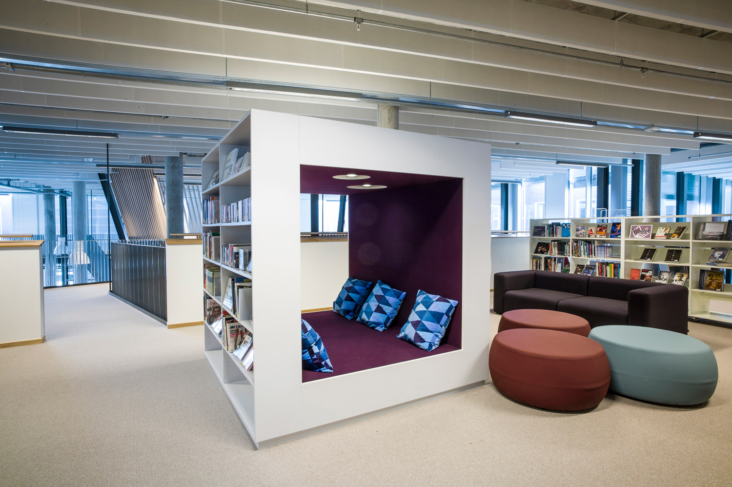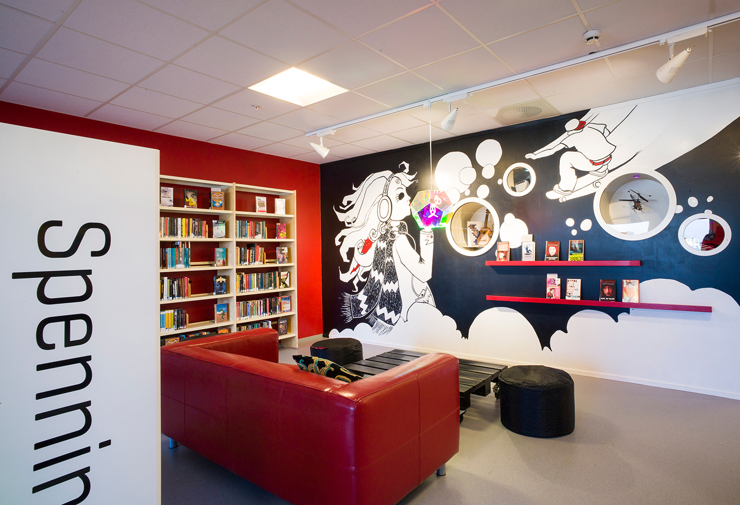 La zone jeunesse est un espace confortable destiné aux jeunes utilisateurs qui ne veulent plus être considérés comme des enfants, mais ne sont pas encore des adultes à part entière : les ADOS. Cette zone doit être un endroit sympa, avec une identité propre et un mobilier ludique que l’on ne retrouve pas ailleurs dans la bibliothèque. Un lieu où les ados peuvent passer du temps et partager de bons moments entre amis.