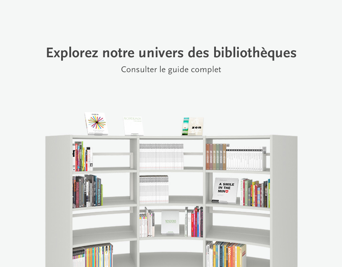 Grâce à notre expérience acquise et maîtrisée en matière d'aménagement de bibliothèques, nous vous conseillons sur les meilleures solutions en matière de gestion, de flux de circulation, de perspectives et de méthodes de présentation originales et novatrices. Nous nous tenons constamment au fait des dernières créations de l'industrie du meuble et portons une attention particulière aux couleurs, aux matériaux et dans le respect des principes du développement durable.