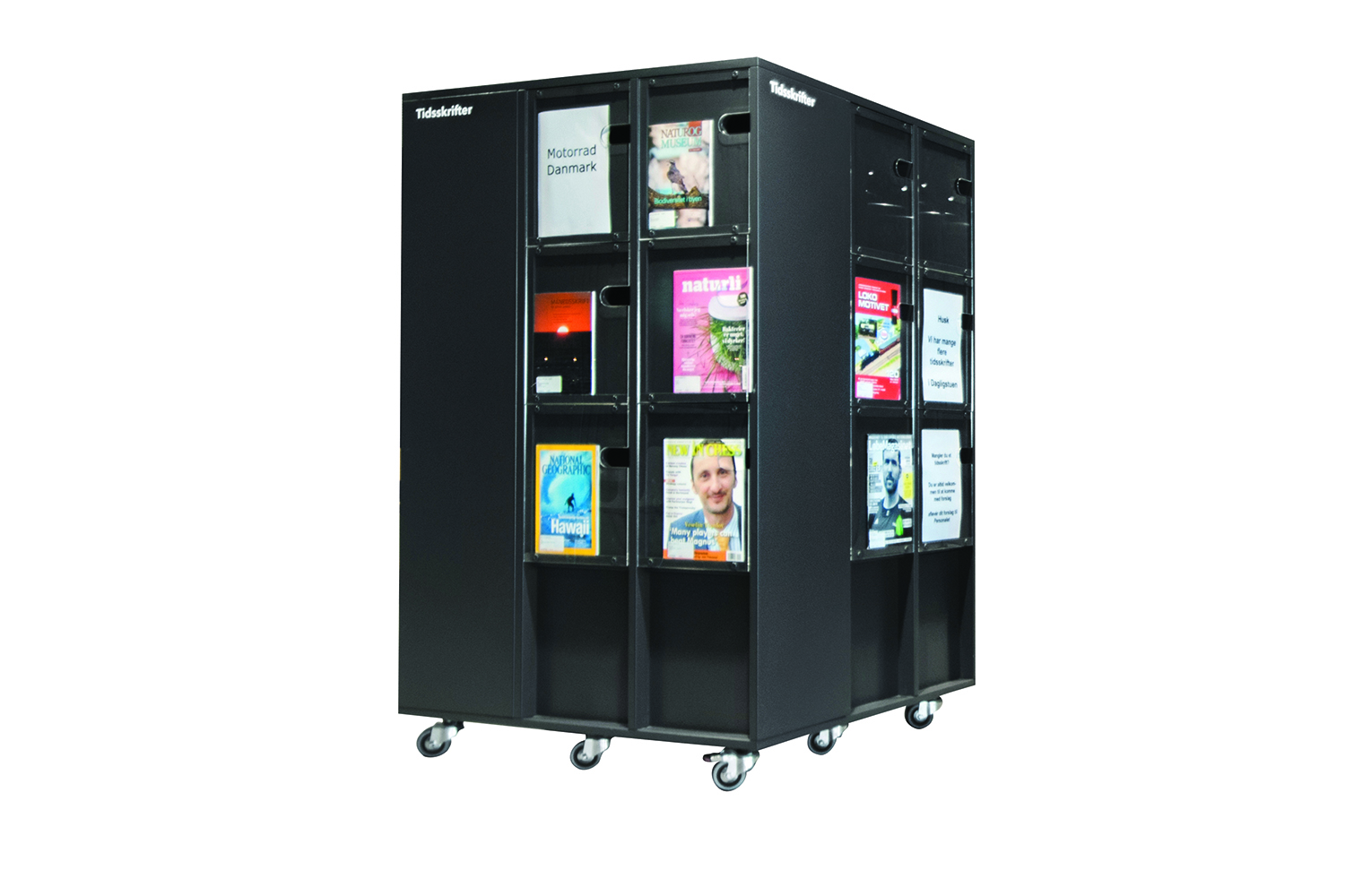 Le système Ordrup Square est une unité combinant réserves et présentoirs à périodiques en roulletes. Il est basée sur les panneaux verticaux Lingo avec des panneaux et des portes avec un présentoir plexi. Derrière les portes avec présentoir plexi, vous trouverez une réserve assez spacieuse pour un format A4 vertical, pour les anciens numéros.