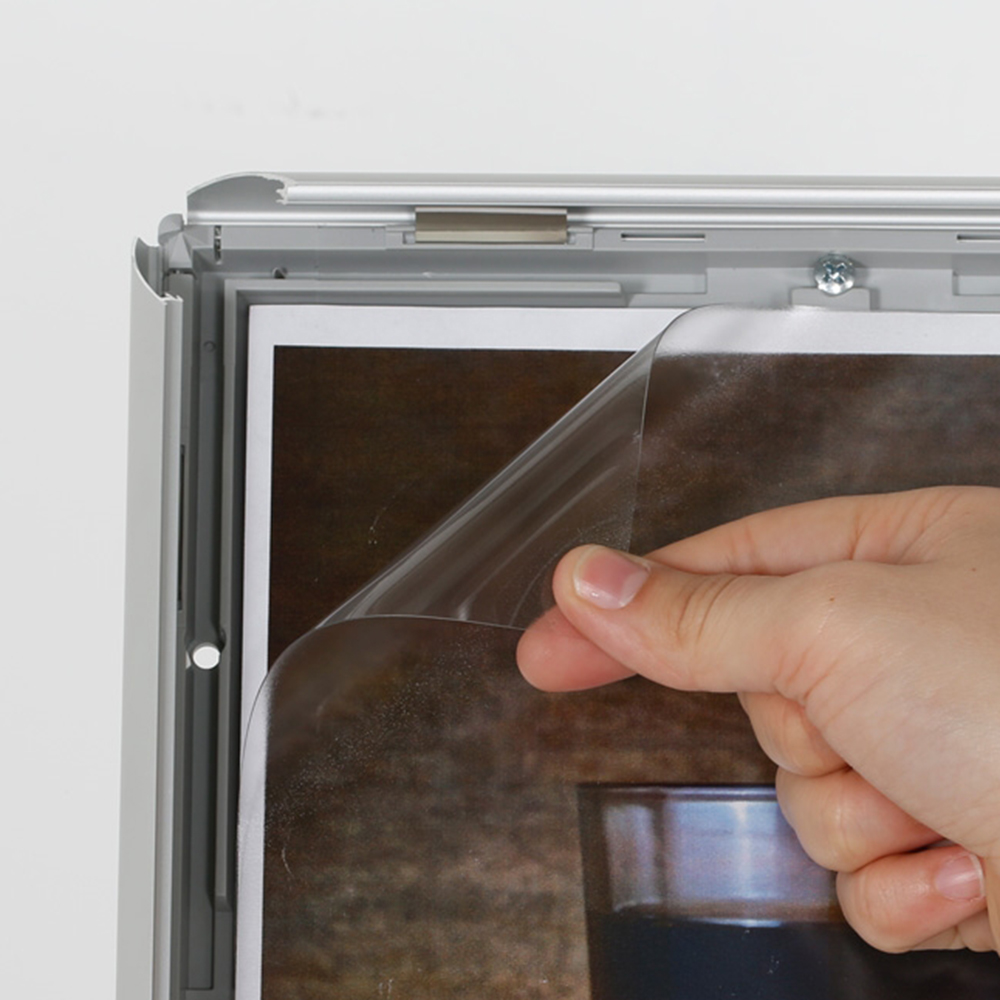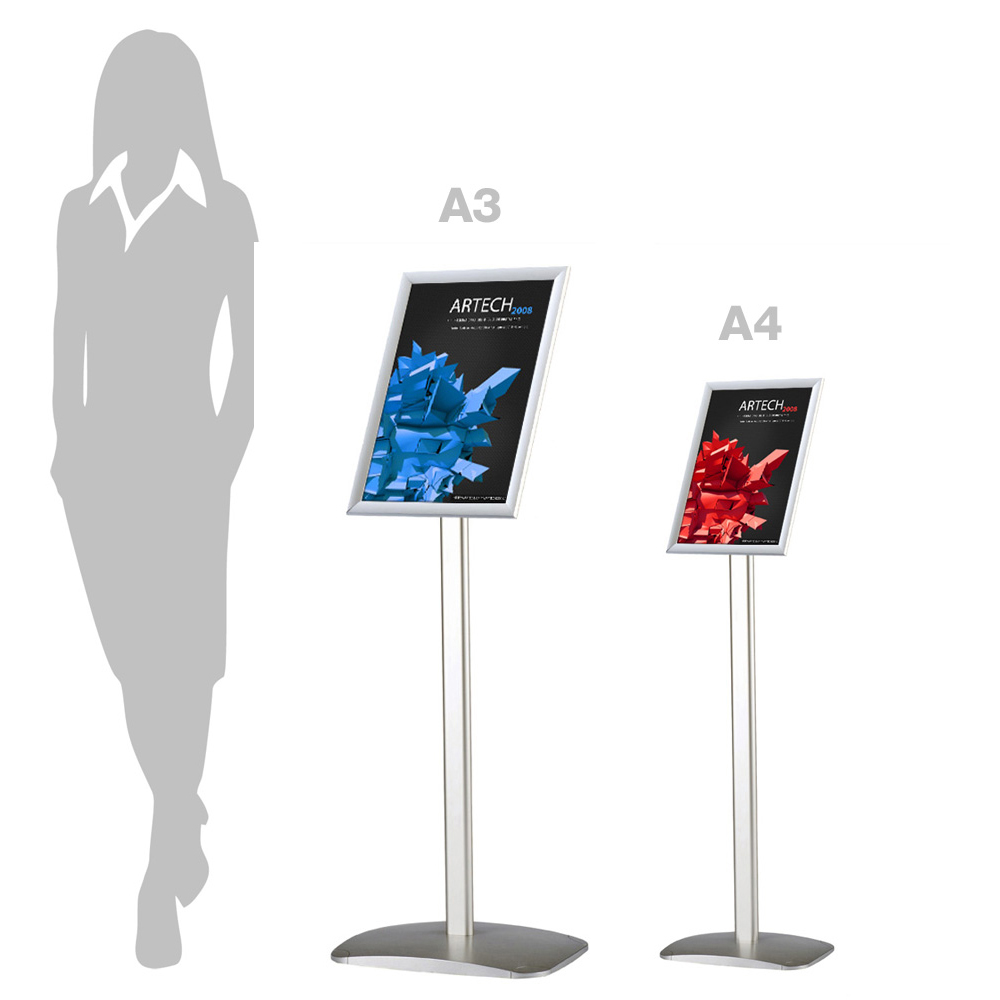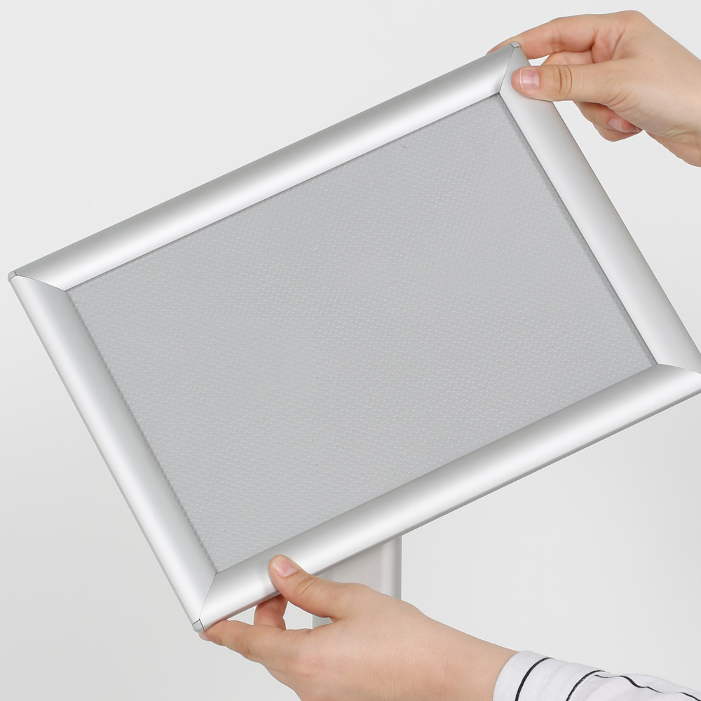 Cadre en profilé de 25 mm.  Avec son pied robuste et sa vitre en plastique antireflet, ce pied d’information peut être utilisé n’importe où dans la bibliothèque ou dans les espaces de réception.