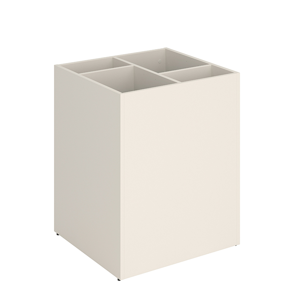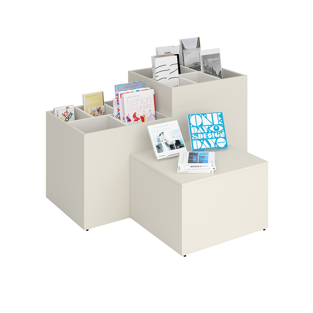 Le podium posséde un couvercle amovible et des séparations astucieuses permettant de diviser la partie supérieure en 2 à 6 compartiments, en fonction de la taille des livres.