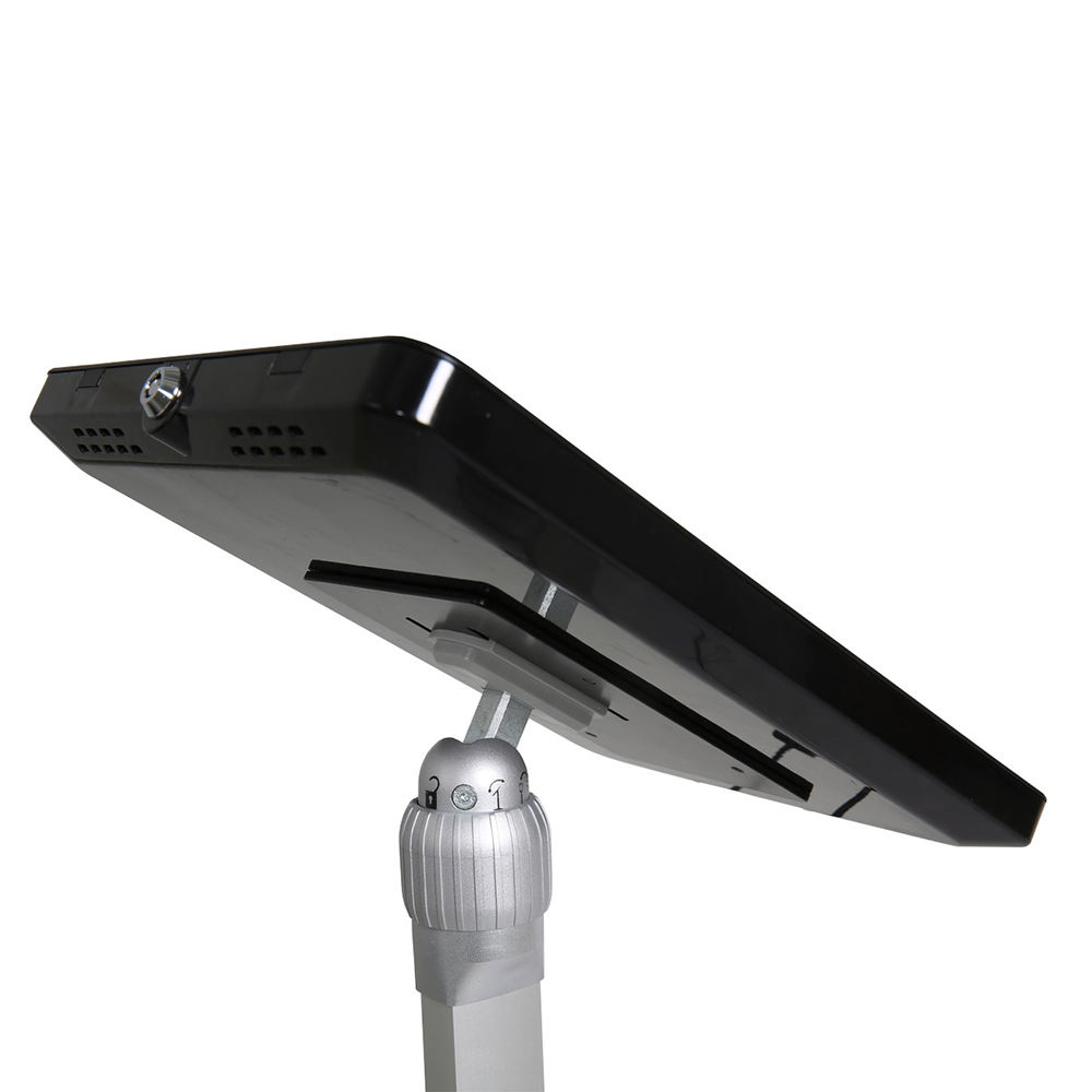 Ce pied est réglable en inclinaison, pour l’angle de lecture, ainsi que sur les axes verticaux et horizontaux. Il est réglable en hauteur pour s’adapter aux positions debout et assise, et est compatible avec quasiment toutes les tablettes.